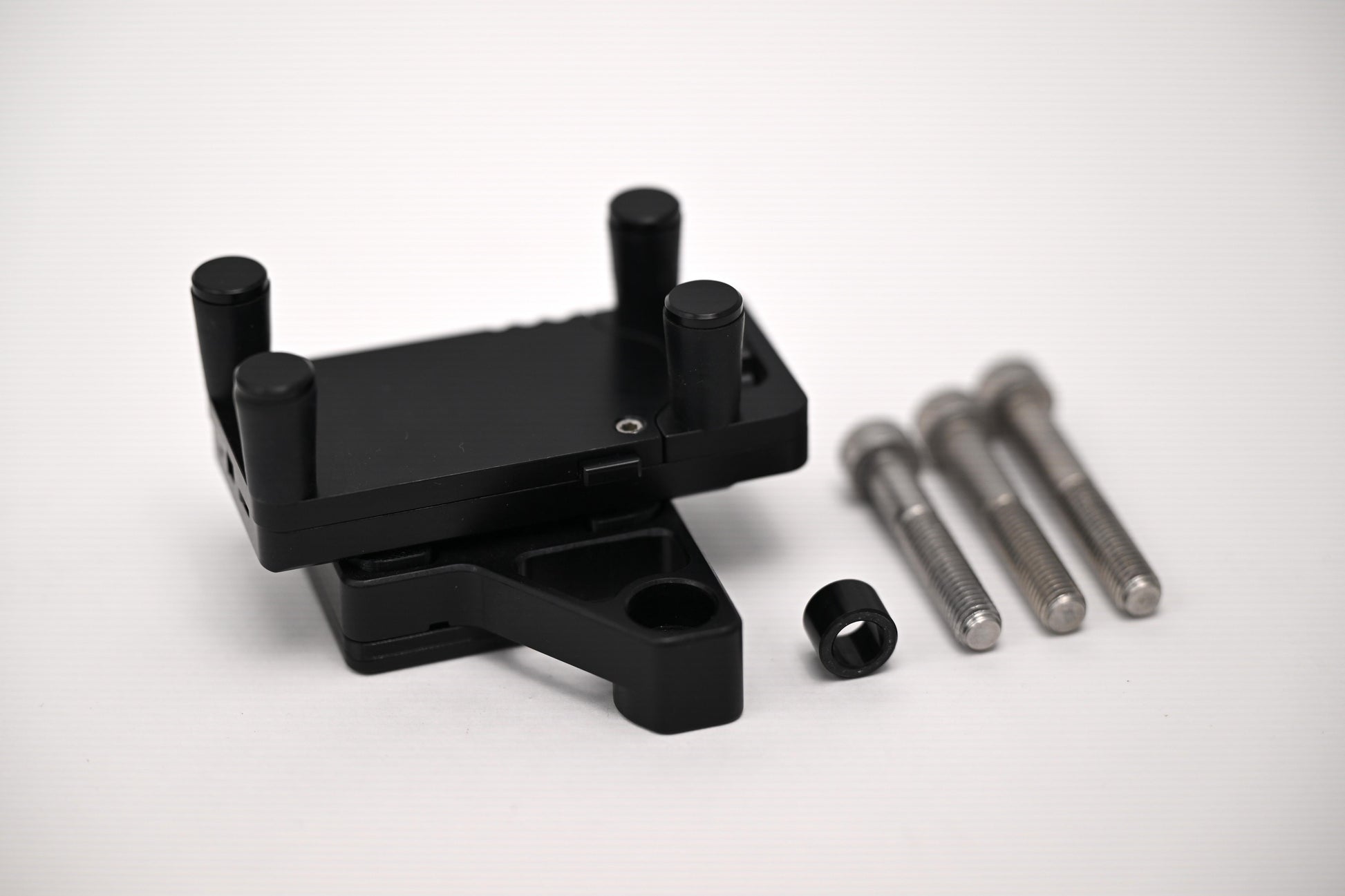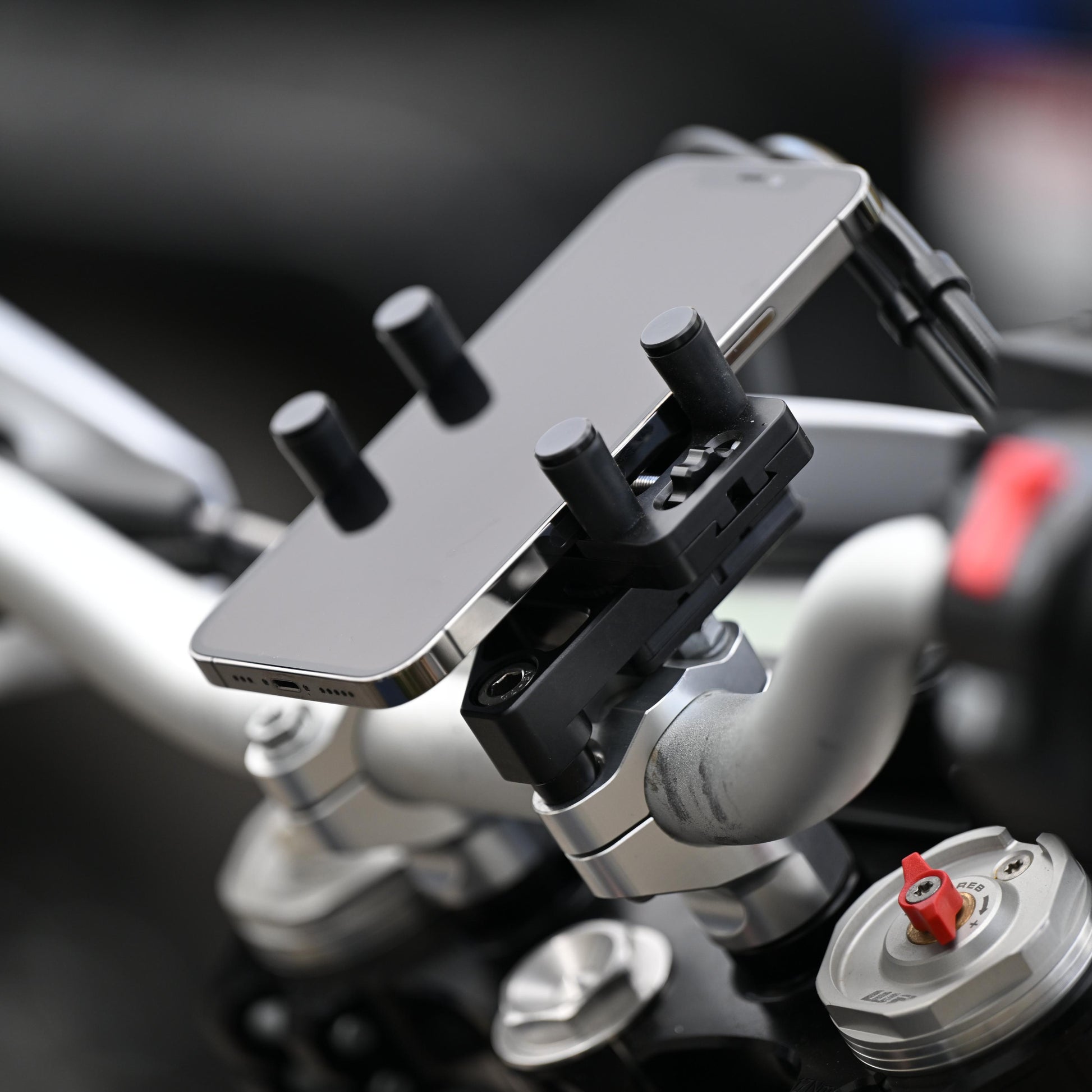 Easily Installs into your preferred handle bar clamp bolts, and mounts in portrait, landscape, or any orientation in between. Locates to the center of the bars in landscape mode on most 90mm span bar mounts for a low-profile!